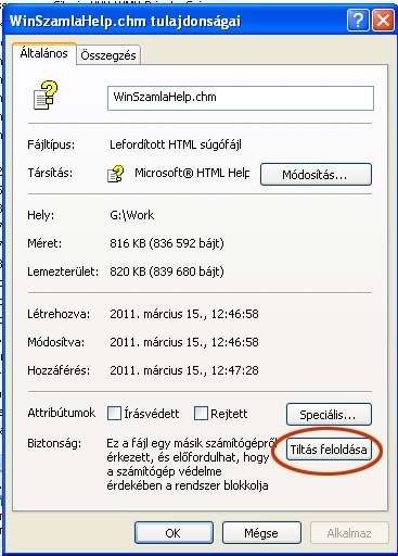 A Windows Xp,és Windows 7 operációs rendszerek gyakran blokkolják az ismeretlen eredetű súgó file-ok használatát. Ezért közvetlenül az internetről nem tudjuk olvasni azokat. Igy a jobb gombbal kattintsunk rá, és cél mentése opciót válasszuk, illetve bal gombbal kattintás után ne a futtatás, hanem a mentés opciót válasszuk. Mentsük le a chm végű súgó file-t valahova a saját gépünkre, majd az intézővel keressük meg, és kattintsunk rá a jobb gombbal, az alábbi ablakot kapjuk, ahol kattintsunk a tiltás feloldása gombra, és okézzuk le. Ezt követően a szokásos módon bal gombbal kattintva gond nélkül olvashatjuk a súgórendszert. Természetesen a súgó file a program telepítésekor is letöltődik, ott ilyen  gond.nem lehet.